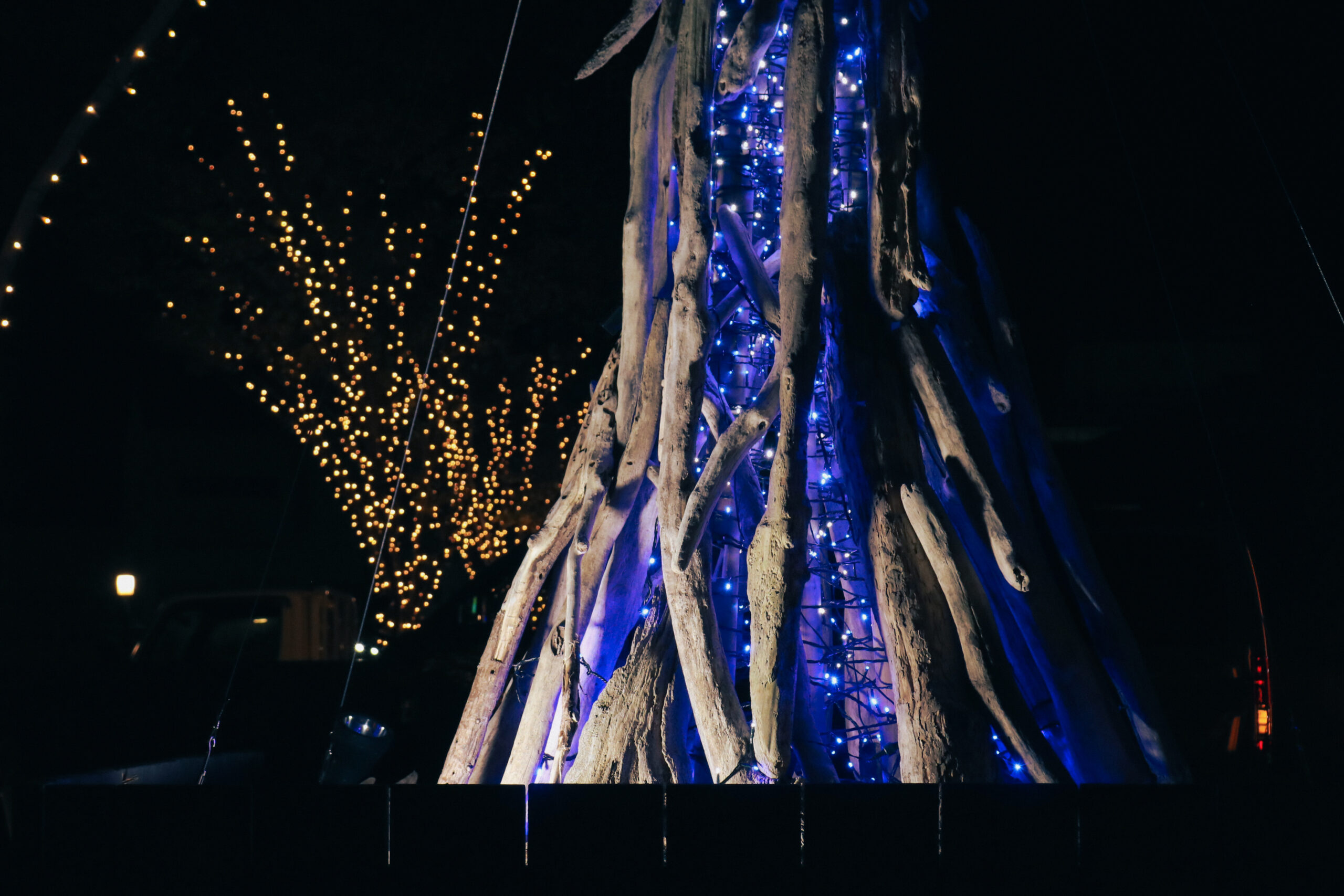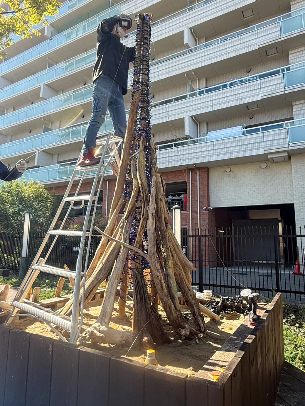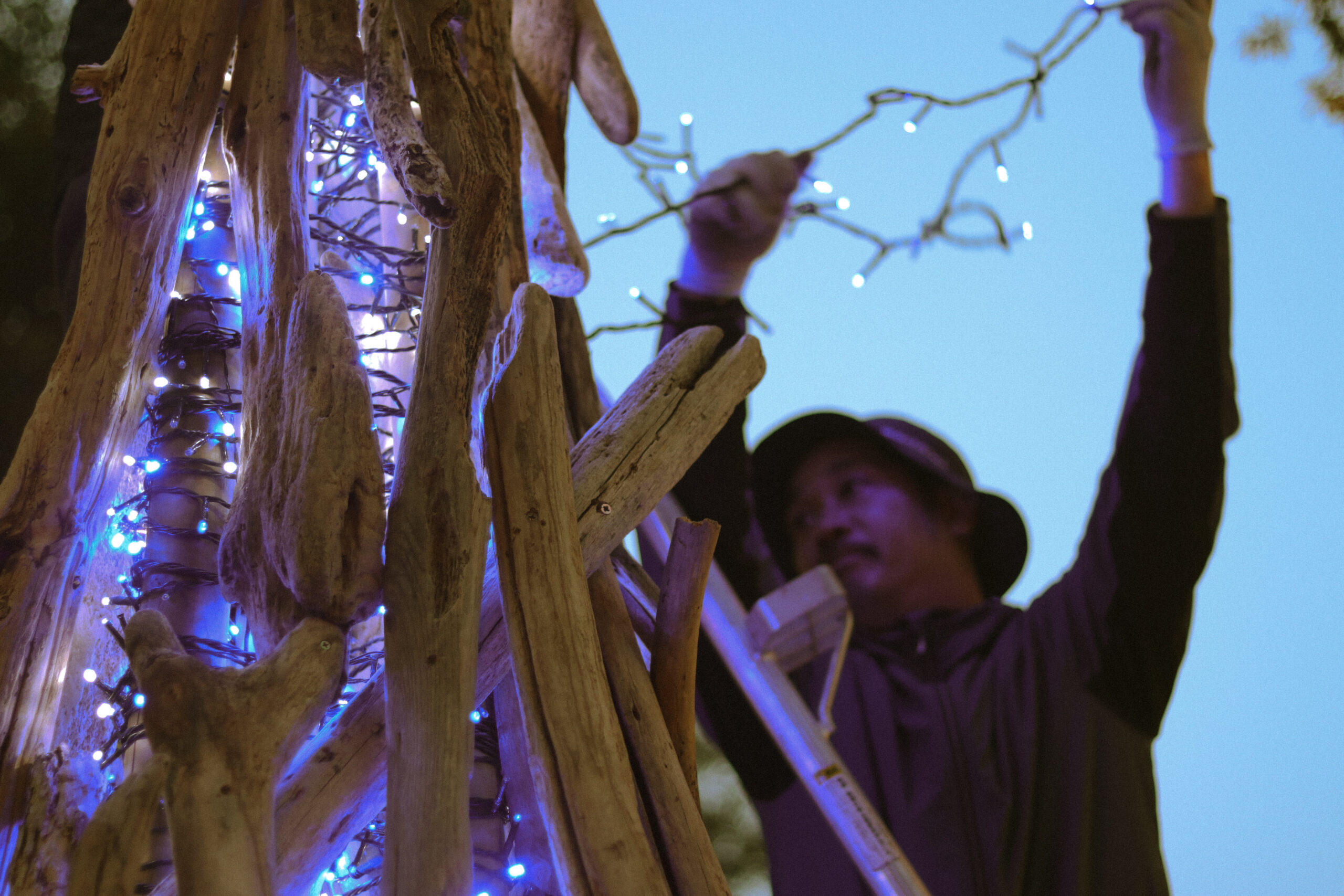 仕上げにライトを装飾すると、夜の空気に溶け込むような「流木ツリー」が完成。