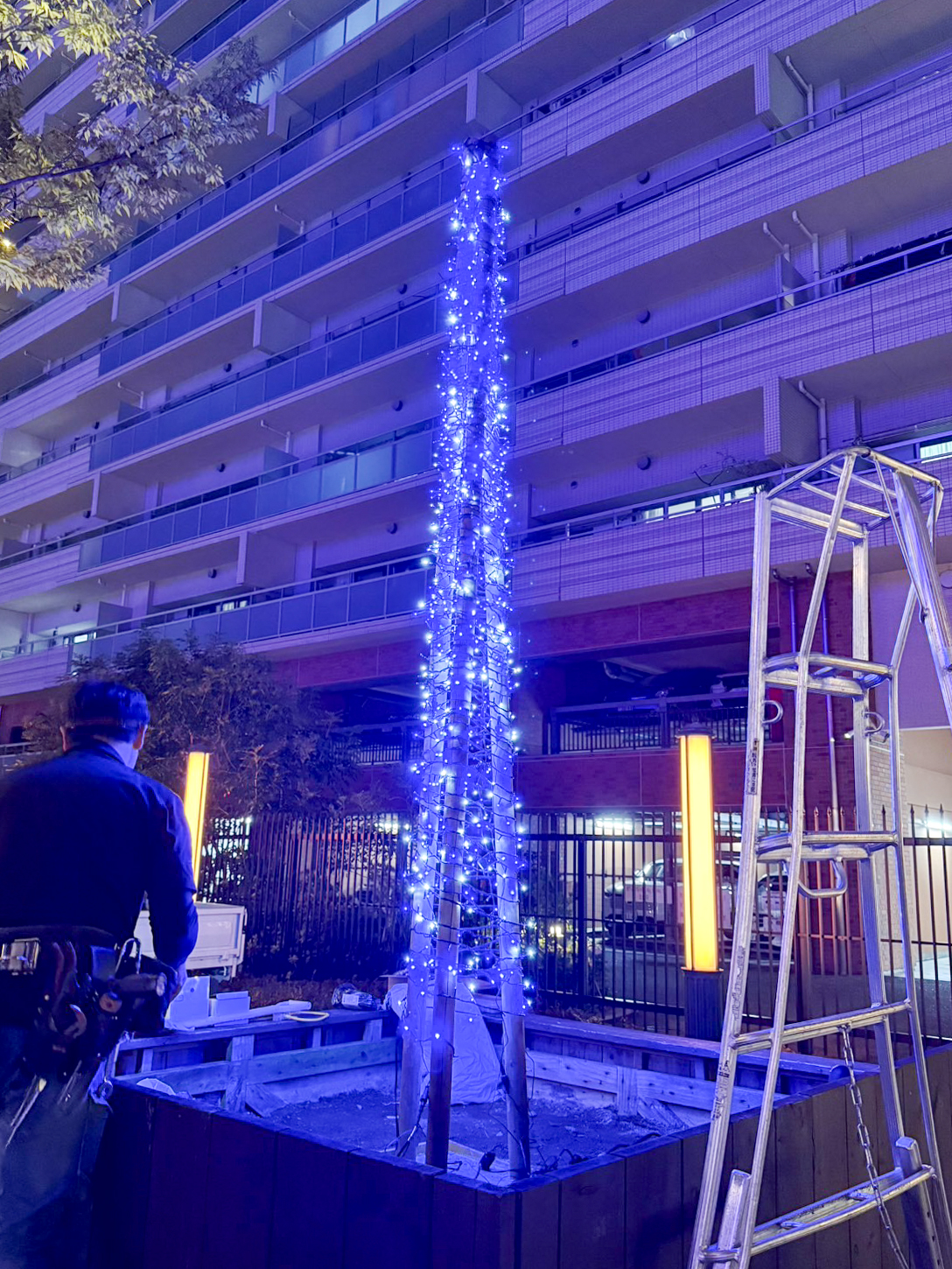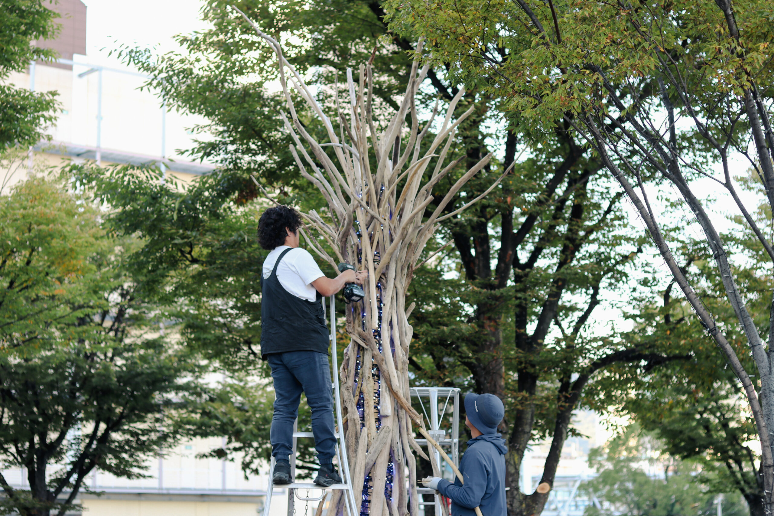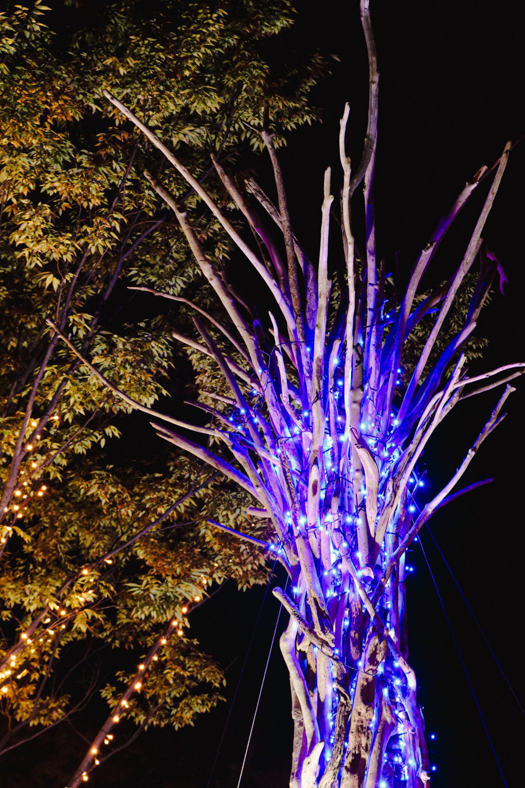 仕上げにライトを装飾すると、夜の空気に溶け込むような「流木ツリー」が完成。