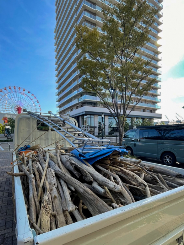 神戸の海が運んできた流木を、スタッフがひとつひとつ選び抜き、トラックいっぱいに積んで神戸煉瓦倉庫へ。