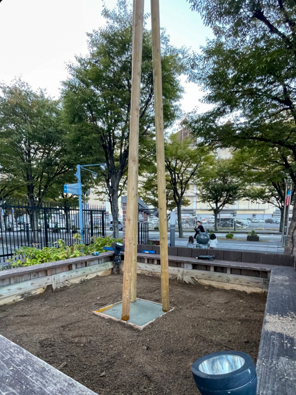 現地では、まずコンクリートでしっかりと支柱の土台を固定。