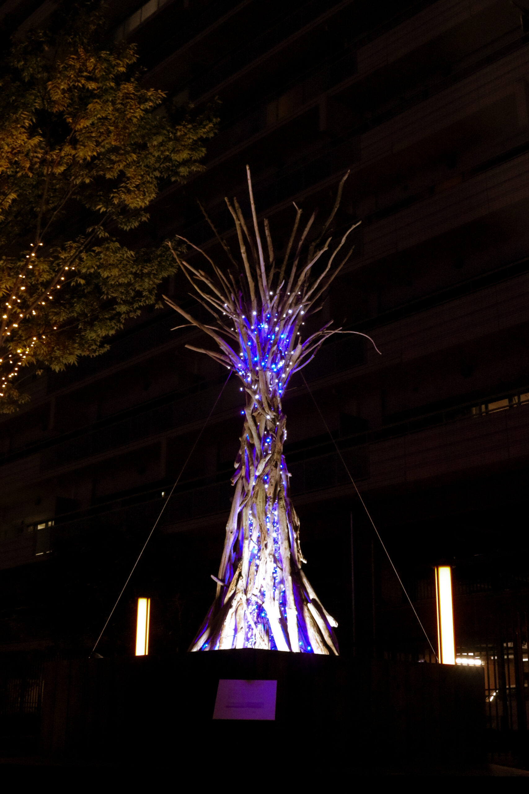 神戸の海が運んだ流木を組み上げたシンボリックな造形で、テーマカラーであるブルーとホワイトの光を組み合わせ、海と空、波と星をイメージしながら神戸の街並みを表現しています。